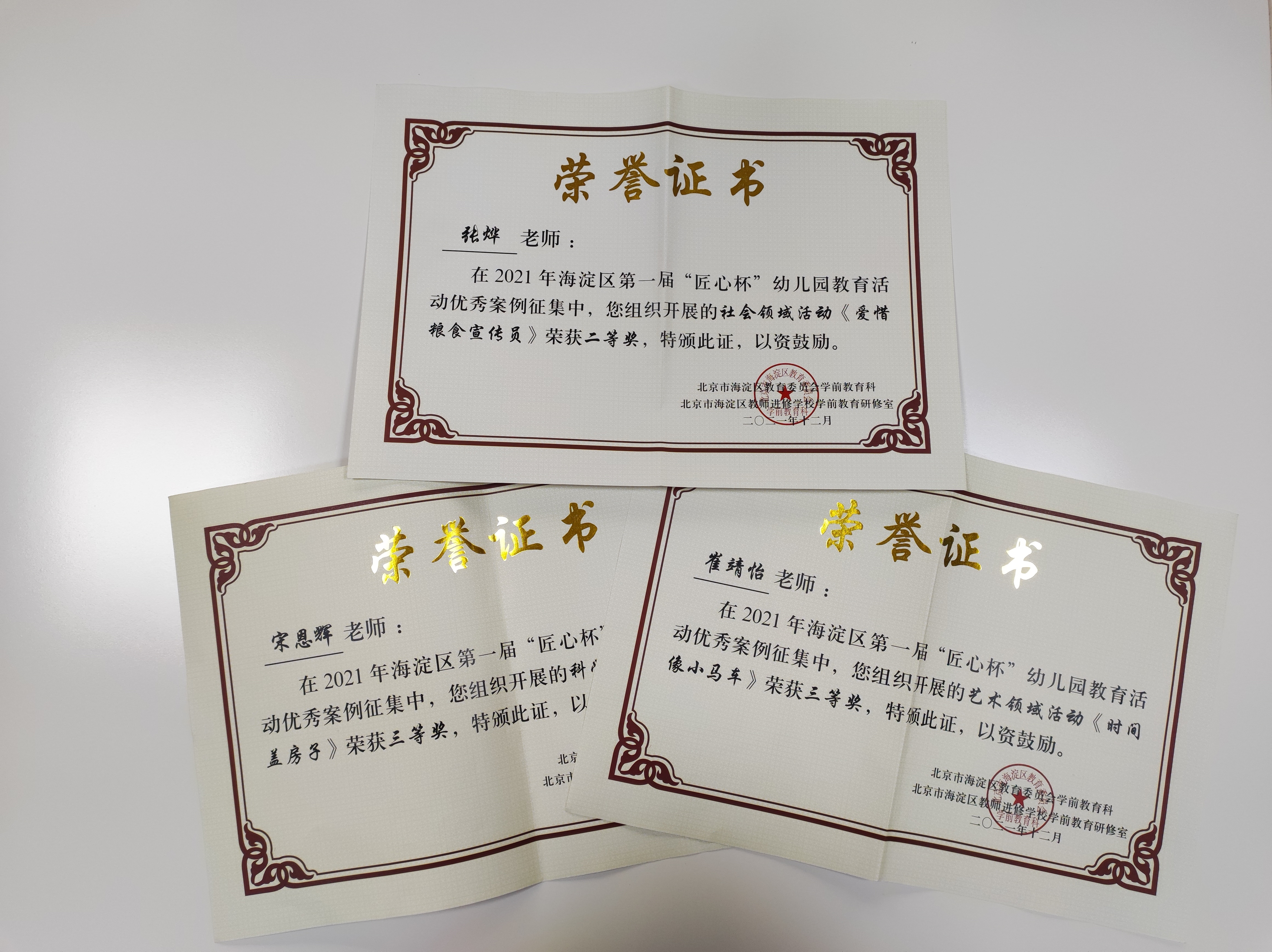 幼儿园通过组织教师参加 “当代杯” “匠心杯”等不同级别的评选活动,帮助教师进一步梳理实践与研究成果,并向海淀教委推荐区级学科带头人及骨干教师,展现了幼儿园在育人方面的价值取向和发展方向,使教师感悟职业幸福,同时,这也是带动幼儿园教师队伍整体向高素质、高质量发展的重要途径。