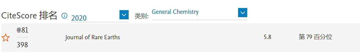 《稀土学报(英文版)》(Journal of Rare Earths)CiteScore 2020:5.8,较2019年度(5.0)提升16%,位于General Chemistry学科Q1区(81/398),较2019年度(90/398)提升9名。