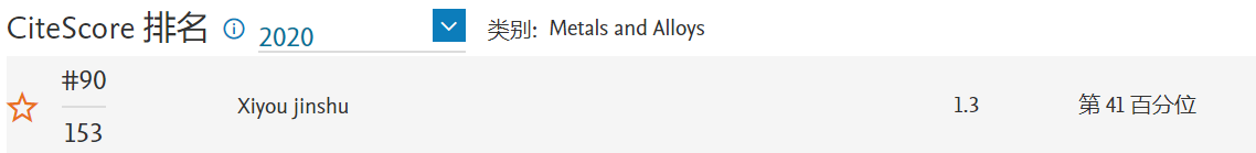 《稀有金属》 CiteScore 2020:1.3,较2019年度(1.0)提升30%,位于Metals and Alloys学科Q3区(90/153),较2019年度(93/152)提升3名。