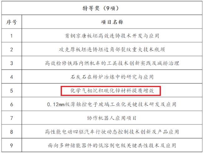 国晶辉“化学气相沉积硫化锌材料提质增效”荣获创新成果特等奖。