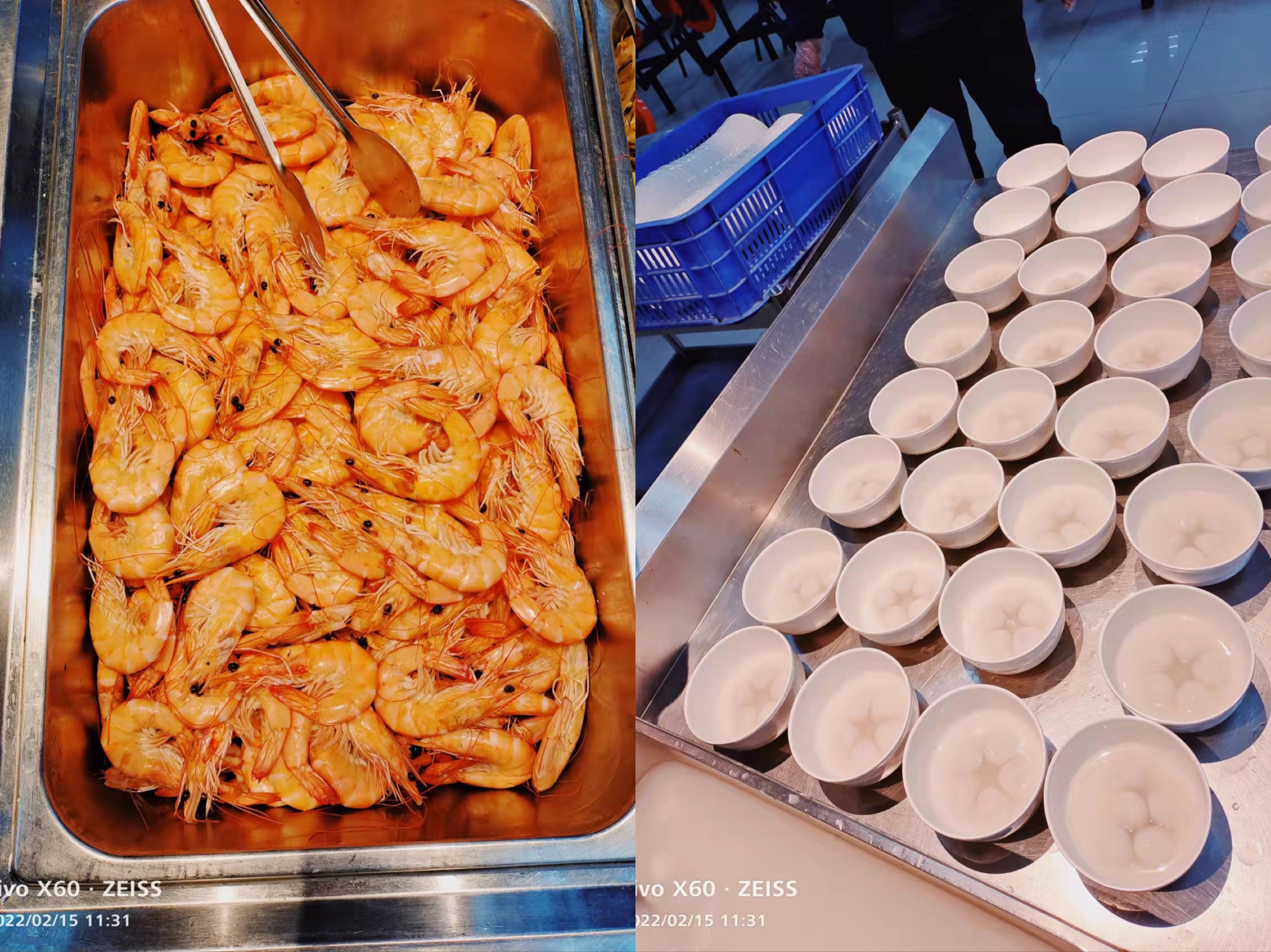 职工餐厅张灯结彩,宣传屏播放着精心准备的“元宵节”小视频。怀柔园区在餐厅入口处布置了猜谜区,为调动员工的积极性,增加活动的趣味性,园区特意准备了抽奖箱,猜出谜底的员工可凭谜面抽取小礼品。大家参与热情高涨,或单独思考、或三五成群交流讨论,活动现场洋溢着一片欢声笑语。猜谜之余,职工餐厅还为大家准备了美味的特色小食品和热乎乎的汤圆。二部园区不仅为职工准备了丰盛精美的菜肴,还特意采购新鲜的大虾端上餐桌。职工餐厅自制了香甜可口的汤圆,为每一位职工送上节日的温馨祝福。