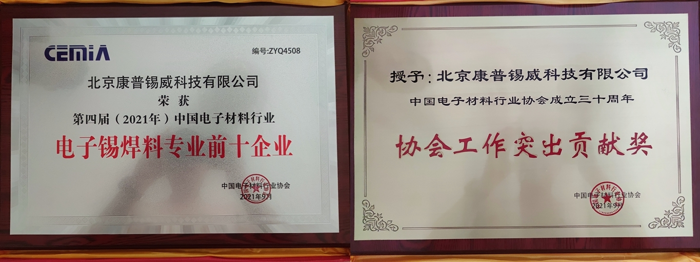 大会期间还进行了第四届(2021年)中国电子材料行业综合排序前50企业及半导体材料等八个专业前十企业榜单发布与授牌仪式。中国工程院院士、中国科学院院士以及中国电子材料行业协会领导等为获奖企业代表颁奖。康普锡威继续入围“电子锡焊料专业前十企业”。