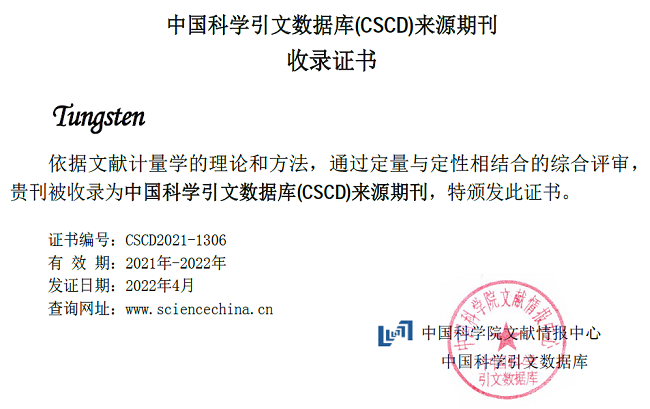 《钨科技(英文)》创刊于2019年,江西省第一本英文期刊,是全球第一本主要报道钨和相关金属及其化合物的英文科技期刊。目前已被EI, Scopus等国际重要数据库收录。
