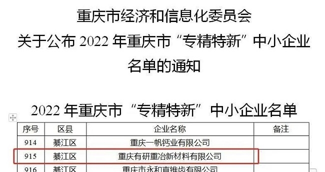 重冶对照重庆市经济和信息化委员会关于组织开展市级“专精特新”中小企业申报工作相关文件要求,经重庆市綦江区经信委进行真实性审核推荐、第三方机构评审、重庆市经信委申报公示等层层程序,进行申报。