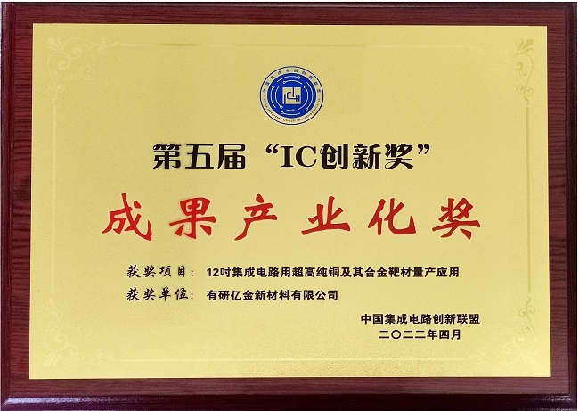 亿金凭借“12吋集成电路用超高纯铜及其合金靶材量产应用”项目荣获第五届“IC创新奖-成果产业化奖”。