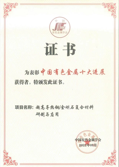 工研院结构事业部“超高导热铜/金刚石复合材料研制与应用”项目成功入选“中国有色金属十大进展”。