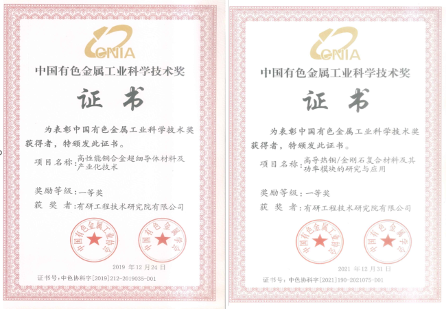 铜合金研究所成功开发了具有国际先进水平的第四代铜/金刚石热管理材料,打通了材料设计制备、产品精密加工和表面处理的全流程脉络,形成了具有自主知识产权的技术体系。实现了高导热、高强度、热膨胀系数可调铜/金刚石复合材料的国产化替代,填补了国内技术和产品空白,满足了国内高功率芯片封装领域对高导热材料的需求,从根本上扭转了之前完全依赖进口的不利局面。相关产品和技术获得2021年中国有色金属工业科学技术奖一等奖,入选中国有色金属工业十大科技进展,入选国务院国资委发布的中央企业科技创新成果推荐目录。