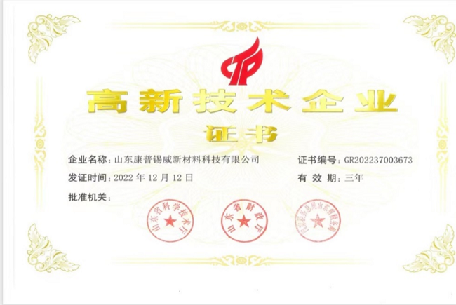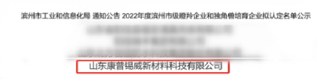 近日,山东康普锡威新材料科技有限公司顺利通过“高新技术企业”认证,入围滨州市“瞪羚企业”拟认定名单,正式迈入高新技术企业的行列。