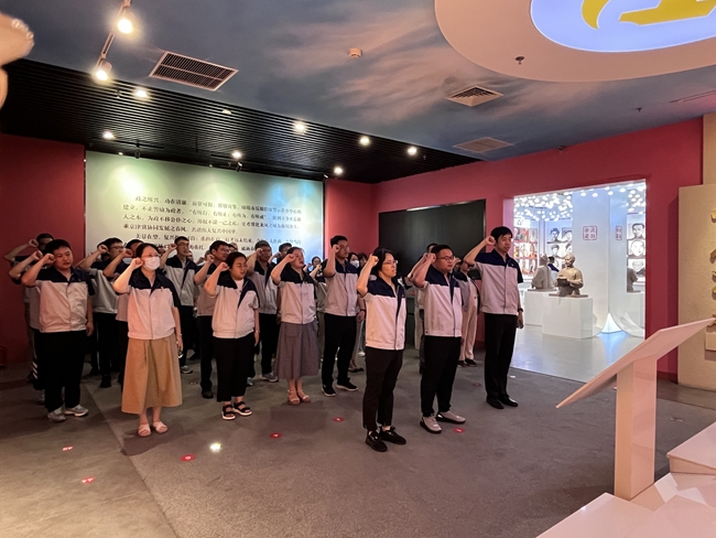全体党员在展馆宣誓厅重温入党誓词,大家高举右拳,在党支部书记、总经理曹波同志的带领下,感悟初心使命,再次接受思想淬炼和精神洗礼,用掷地有声的誓词表达了对党虔诚而执着、至信而深厚的真挚情感。