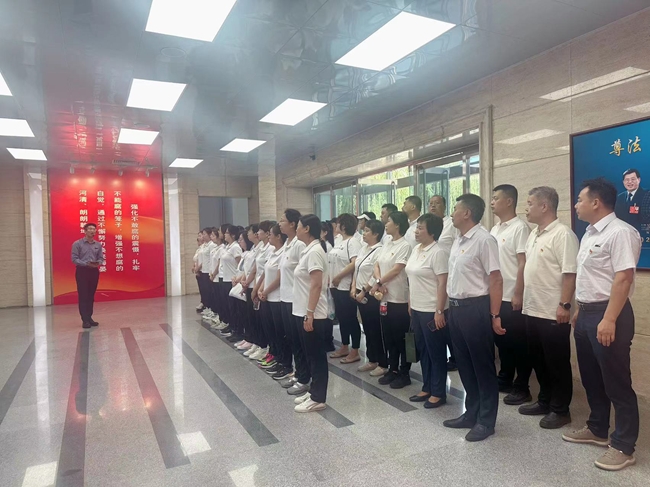 在讲解员的引导下,大家先后参观了“挺纪在前、筑牢防线”“以案为鉴、知畏知止”“不忘初心、牢记使命”三大主题展厅。展厅中以大量影像、图片资料对近年来中央和北京市正风肃纪、严肃问责的典型案例进行深入剖析,沉浸式体验监区“一日改造生活”,强烈的代入感宛如声声警钟,使大家深受震撼和触动。最后,面对鲜红的党旗,全体党员干部重温入党誓词,在铮铮誓言中感悟初心使命。