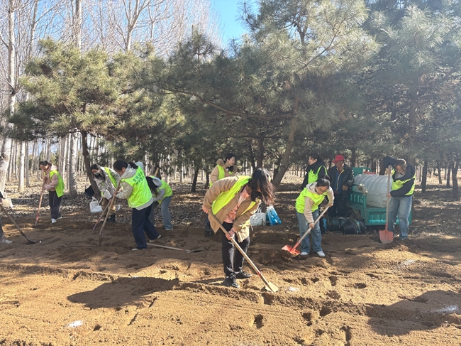 活动伊始,基地工作人员详细讲解了树木种植及养护知识。领取树苗和工具后,众人手持铁锹,热情高涨、干劲十足,分成多个小组投身植树护绿行动。铲土挖坑、踩土固苗、填土围堰、浇水护苗,在大家齐心协力的努力下,35株侧柏扎根于此。原本空旷的土地上,新栽的树苗错落有致,在微风中展现出勃勃生机。大家还完成了基地150余株林木的抚育任务。