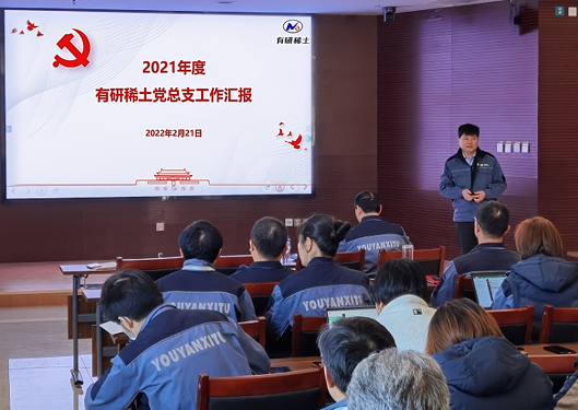 稀土党总支召开2022年度第一次党员大会,党总支书记、总经理于敦波代表党总支委员会向全体党员报告2021年度党总支工作,接受党员评议。党总支委员、经营班子成员及70余名党员现场参加了会议,乐山、荣成和青岛子公司党员通过视频参会。党总支副书记、副总经理许国栋主持会议。