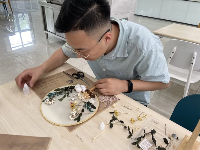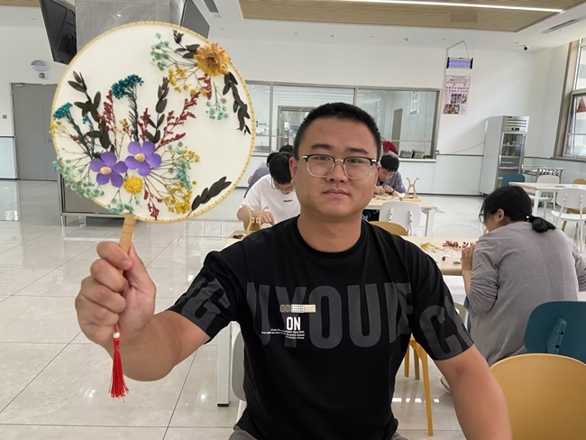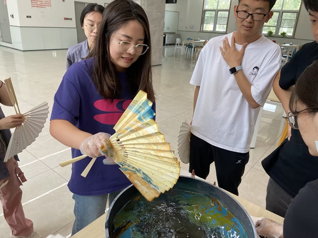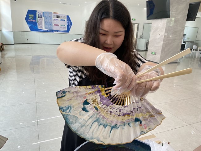 活动现场准备了扇纸、扇骨、团扇、花材、油彩等道具。在老师的指导下,青年员工们有的使用折扇,将扇面放入倒满油彩的水中印出五彩斑斓的色彩;有的选择团扇,将各类花材粘贴到空白团扇上,搭配出清新淡雅的画面。现场气氛活跃,其乐融融。