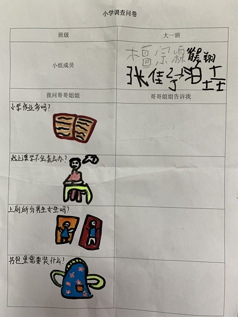 本次活动是疫情三年来幼儿到园外的第一次大型活动,幼儿园精心筹划组织,同民族小学商议落实活动行程、内容实施细节,做了充分的准备。小朋友们围绕与“小学”相关的话题进行了多次讨论。“上课听不懂怎么办?”“每天要学多少门课”“小学的作业是不是很多?”“上小学后在哪里吃午饭”“小学还能睡午觉么?”“小学几点放学”……针对这些问题大家精心绘制了问题记录表。
