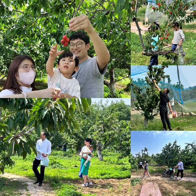 活动中,家人带着孩子手提采摘蓝,互相协助,采摘樱桃。大家精神饱满、热情高涨,体验着劳动丰收的喜悦,品味分享着美味的果实,活动带给大家亲近自然田园的机会,同时也拉近了孩子之间、家庭之间、同事之间的友谊情感。