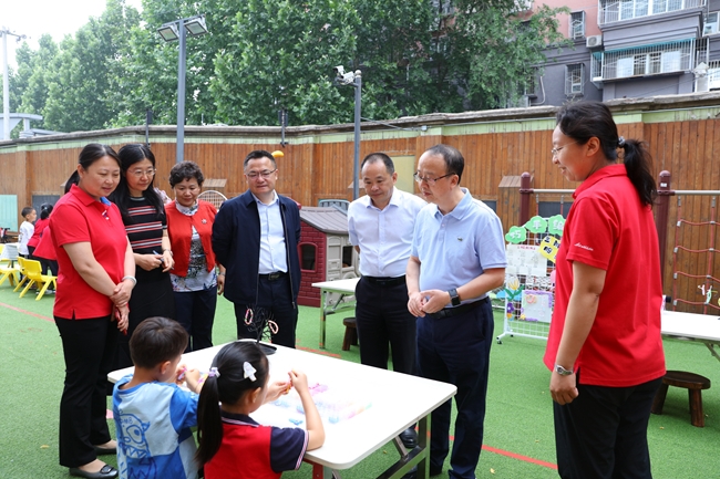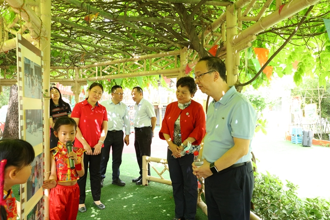 毛昌辉观看了幼儿园丰富多彩的迎六一活动并听取了活动介绍,肯定了教职员工付出的努力,并参与了水拓画、笔墨童心等游戏项目。