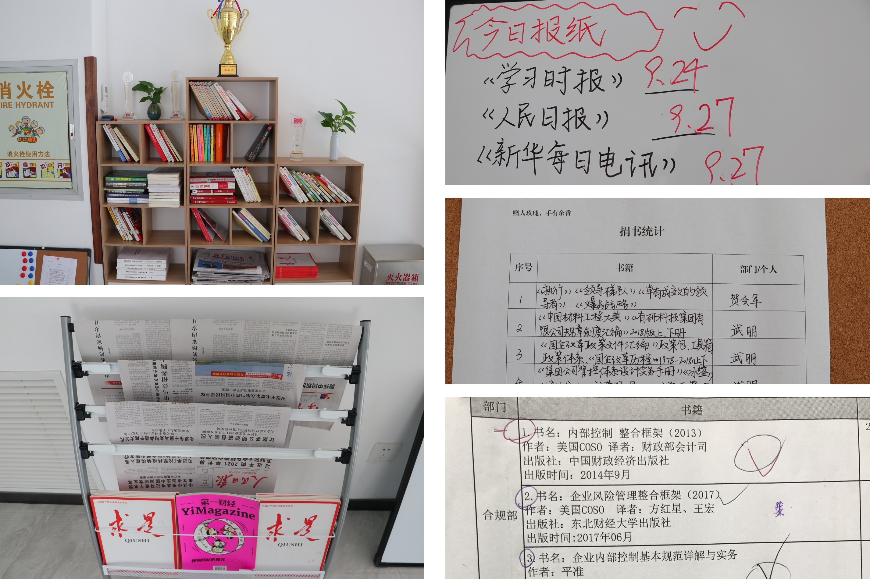 粉材设立了图书角,购置了《人民日报》《学习时报》《哈佛商业评论》报刊,并开展图书漂流活动,鼓励员工们共享家中闲置的好书,共收到包括《领导梯队》《薛兆丰经济学讲义》《半小时漫画经济学》在内的30余本书籍。此外,六合彩特码