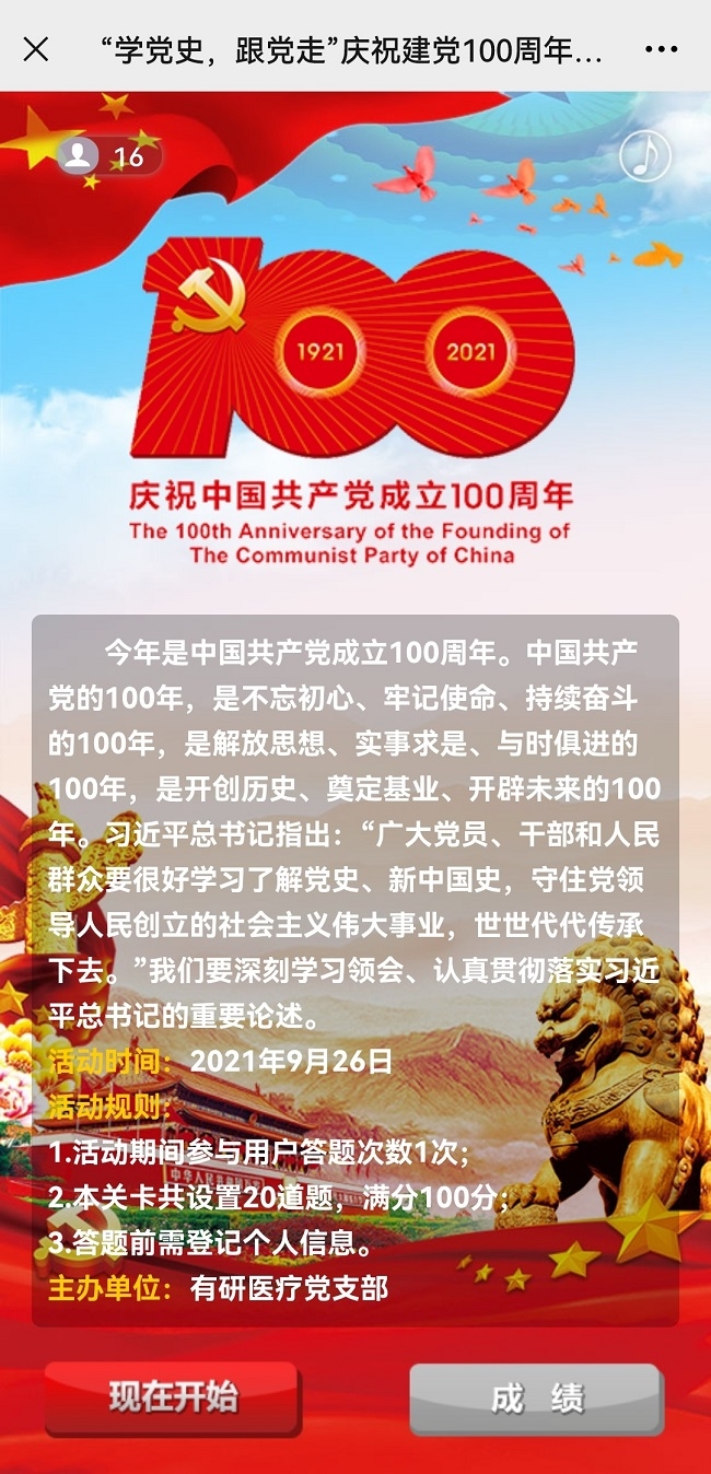 医疗党支部于9月26日组织全体党员、入党积极分子开展了“学党史,跟党走”庆祝建党100周年党史知识竞赛。竞赛包括单选题和多选题,题目随机生成,共20道题目,每人1次答题机会,答题限时10分钟。经过激烈角逐,最终评选出一等奖1名,二等奖2名,三等奖3名,优秀奖和参与奖若干名。