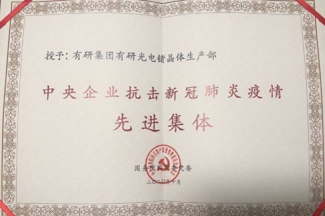 光电锗晶体生产部被国资委授予“中央企业抗击新冠肺炎疫情先进集体”称号。