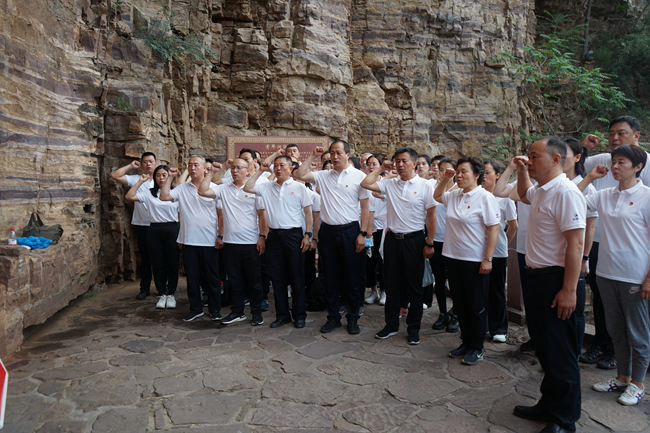 接下来,党员们沿着红旗渠建设者的足迹,重走“水长城”,参观了红旗渠的分水枢纽——分水闸,徒步登上红旗渠咽喉工程——青年洞。在青年洞前,大家面向鲜红的党旗重温入党誓词,庄严宣誓,铿锵有力的誓言在青翠的山谷间久久回荡。
